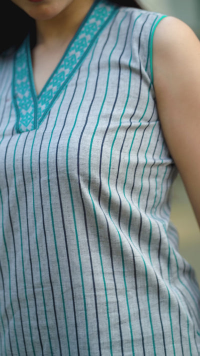 The Coral Green Dhonekhali Wrapped Dhoti Co-ord Set beautifully combines traditional Dhonekhali cotton with a contemporary Indo-Western silhouette. Crafted from pure cotton, this ankle-length co-ord set features a stylish V-neck top with intricate neck-patch detailing and elegant piping work. Paired with an adjustable cotton pleated dhoti, it ensures both comfort and sophistication. The lightweight and breathable fabric make it a perfect choice for effortless summer styling, exuding charm and versatility.