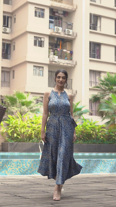 Step into timeless elegance with our Silk Halterneck Dress with Belt, a perfect fusion of Indo-western style and luxurious comfort. Crafted from breezy silk fabric, this dress features a stunning Vanaspati print that adds a touch of sophistication. The halter neck design and accompanying belt enhance its chic appeal, making it a versatile addition to your wardrobe. Whether for a casual day out or a special occasion, this dress promises both comfort and style.